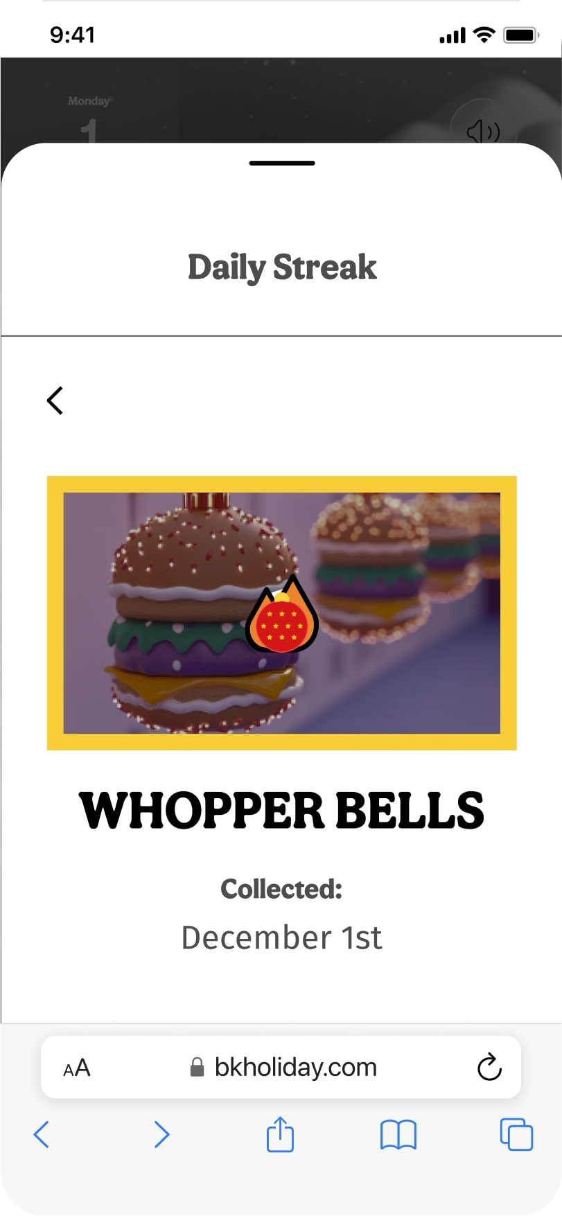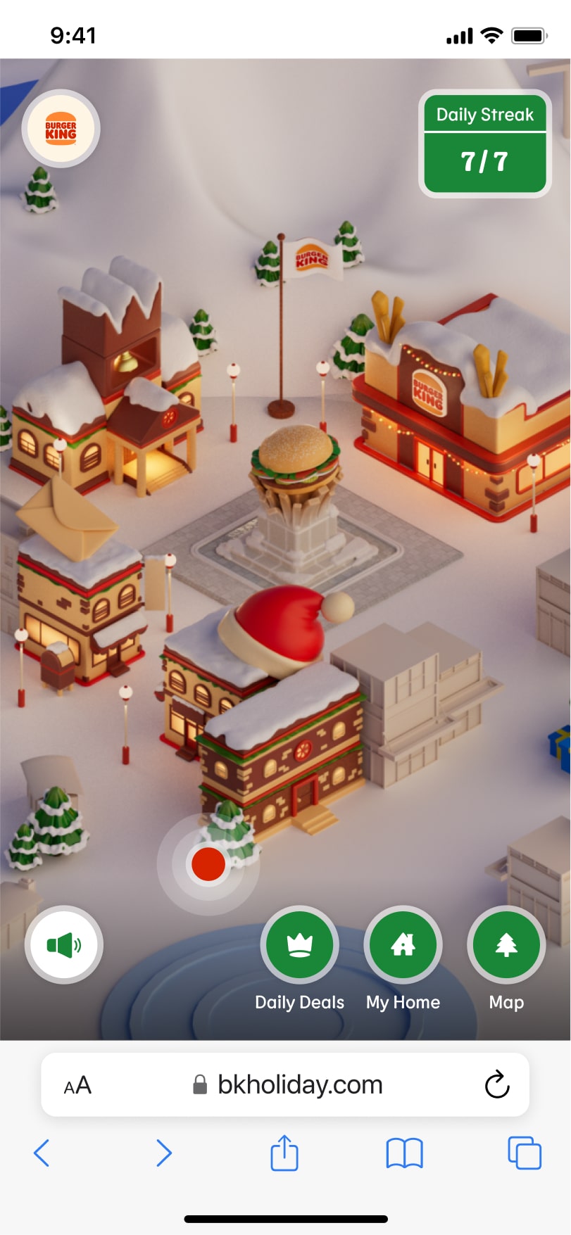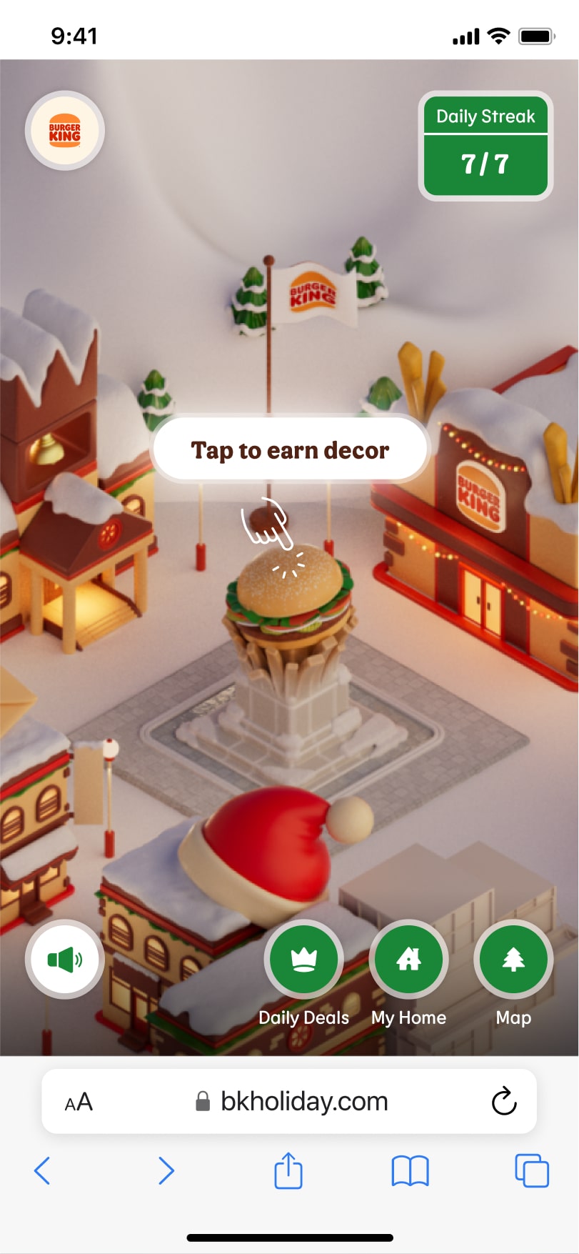 For the experience, three key activities: redeem the daily deal (i.e. a coupon for a BK menu item), collect decorations for a holiday home with the incentive of weekly streak rewards, and explore the holiday village.